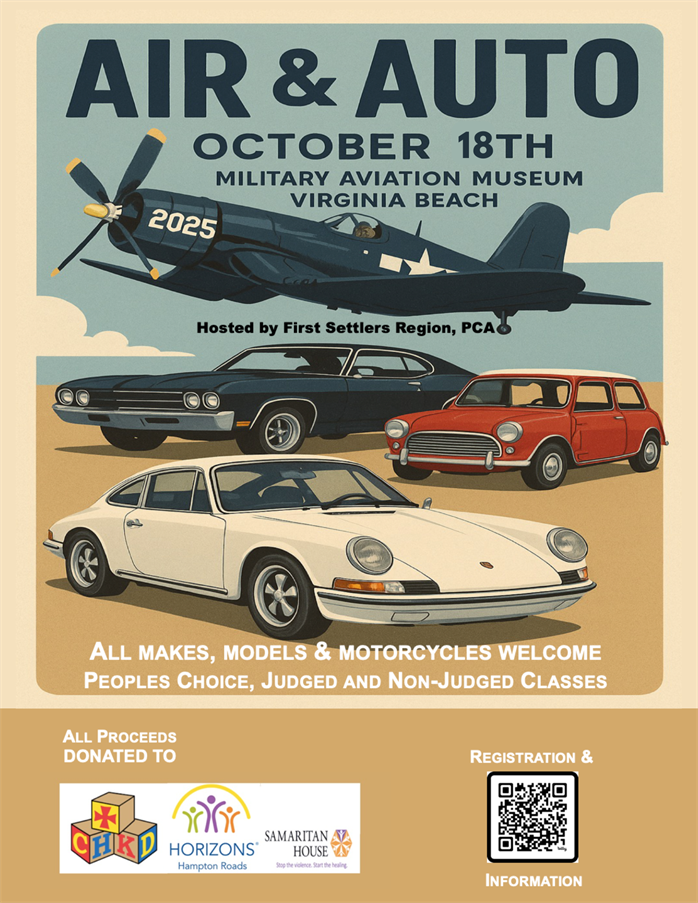 Join us for a day of cool cars, great people, and giving back, Saturday, October 18th 11:00 AM – 4:00 PM at Military Aviation Museum, in Virginia Beach!