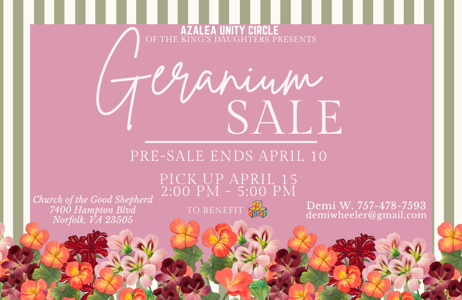 Pick Up Wednesday, April 15th from 2-5:00pm at Church of the Good Shepherd, (7400 Hampton Boulevard Norfolk, VA).