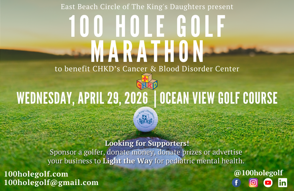 In the first three years, our 100 Hole Golf Marathon has been the vehicle through which East Beach Circle of The King’s Daughters has raised a total net profit of $201,500.00 for CHKD's Mental Health Hospital, Children’s Pavilion. With your support, our 4th annual event will be another wildly successful fundraiser for CHKD, with this year's focus on The Children's Cancer and Blood Disorders Center.