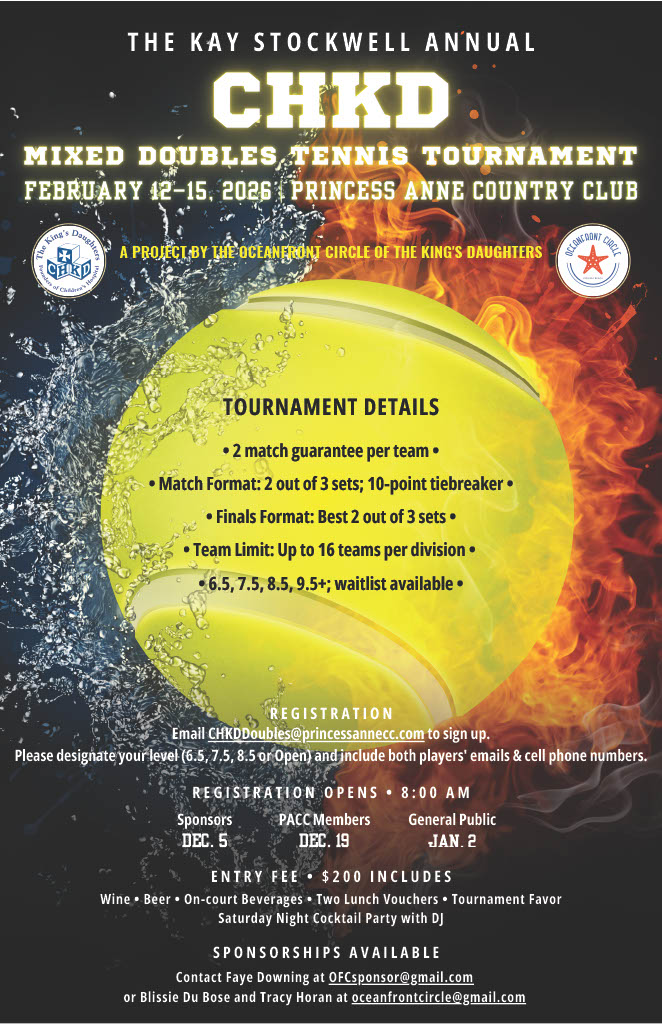 This event is open to club members and non-members and each person will play 2-3 matches. Divisions include 6.5, 7.5, 8.5, 9.5+. Registration through this website at any level does not guarantee you admission into the Kay Stockwell Annual CHKD Mixed Doubles Tournament. All admitted registrants will be notified of their acceptance directly from the tournament director, John Fraser.