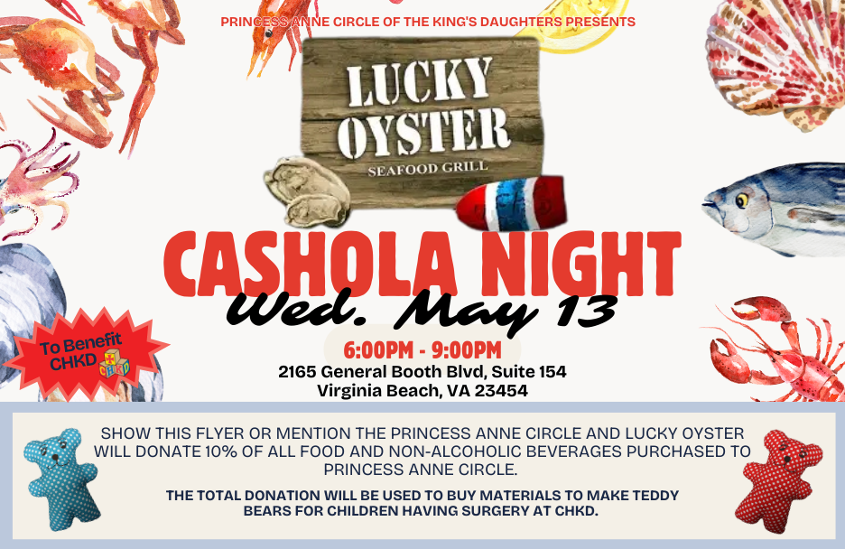 The Princess Anne Circle invites you to their Cashola Night event on May 13, 2026!! This event will be held at the Lucky Oyster Restaurant in Virginia Beach!