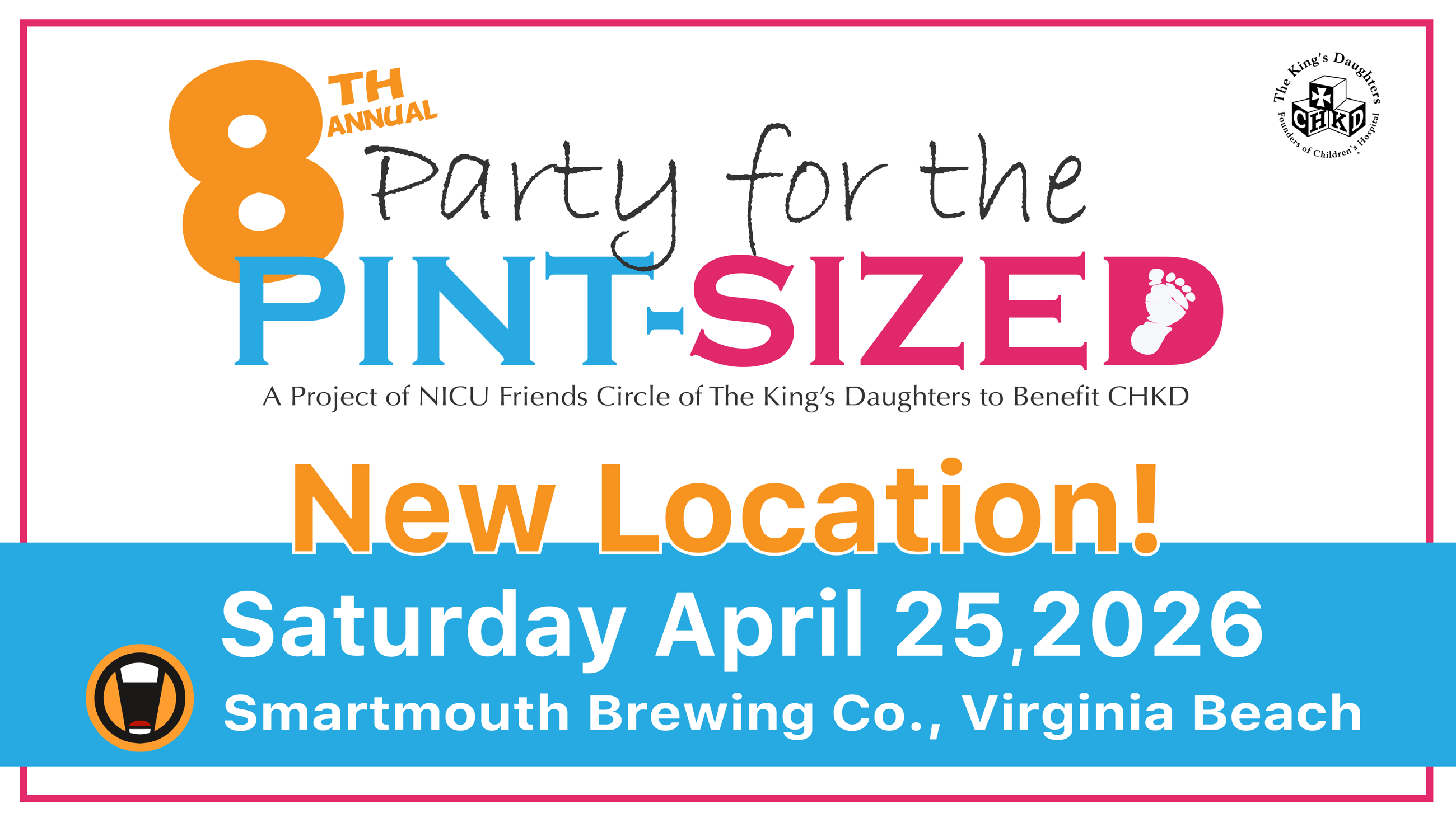 Join NICU Friends Circle's Party for the Pint Sized! Enjoy local craft beer, delicious fare, live entertainment, silent auction and more @ Smartmouth Brewing Company in Virginia Beach to benefit CHKD!